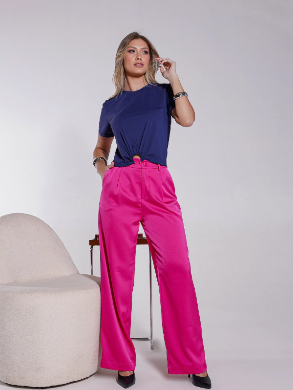 ● Evento formal ou festa: Combine a calça com uma blusa de seda ou um top sofisticado e sapatos de salto alto. O caimento pantalona e a alfaiataria acetinada garantem um visual elegante e refinado.